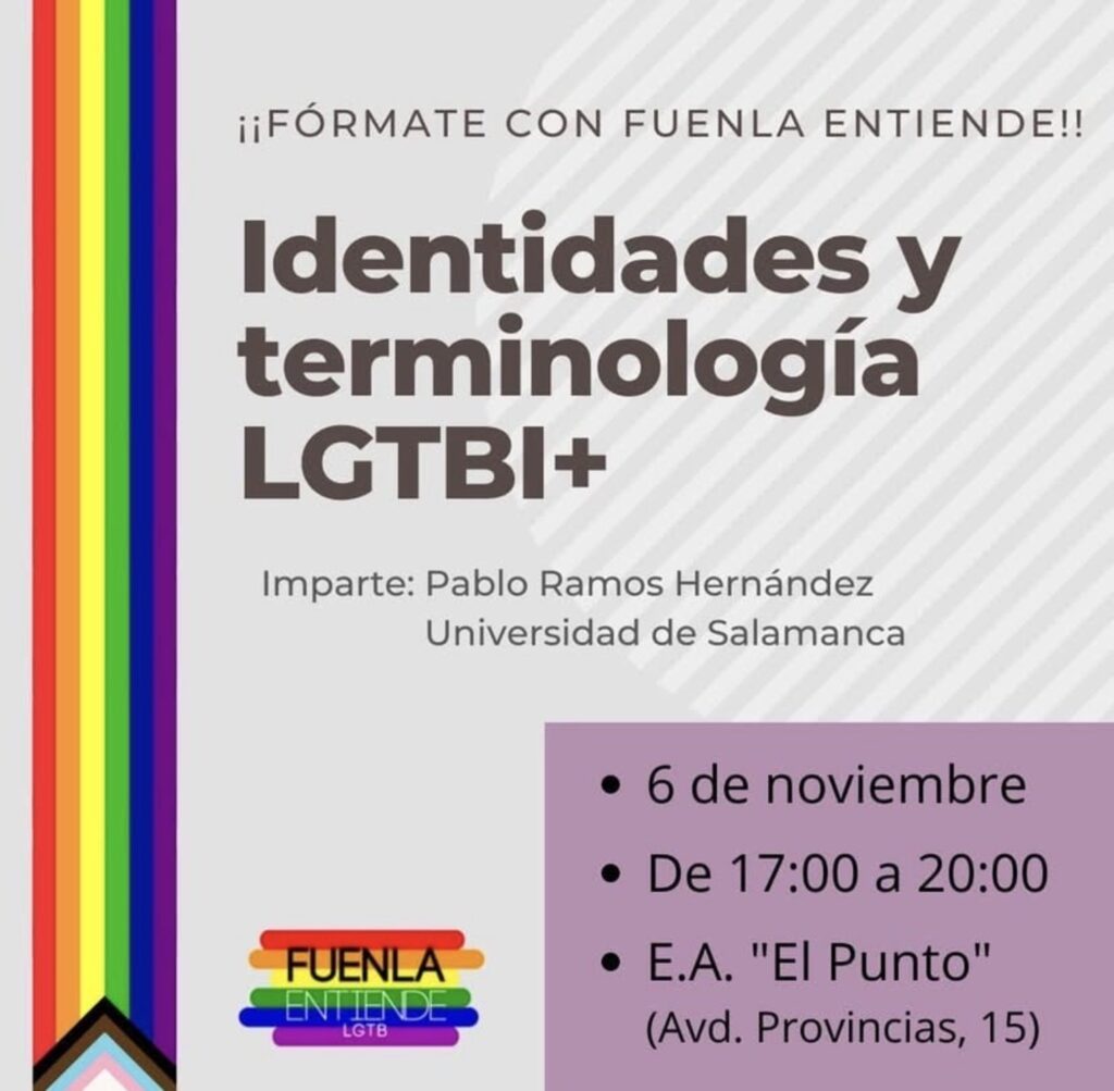 El día 6 de noviembre de 2021 se organizó la actividad formativa Identidades y terminologías LGTBI+ desde la Asociación Fuenla Entiende LGTB de la que fui el formador.